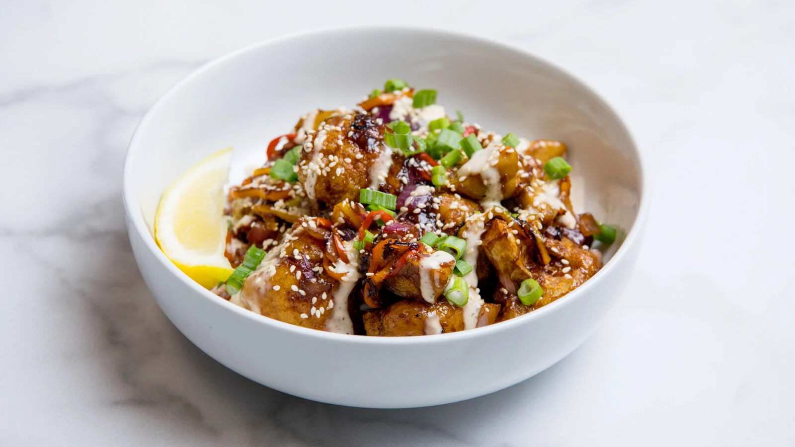 Gluten-free, vegan cauliflower wings tossed in our Korean BBQ sauce and served with housemade vegan ranch dressing. (GF, V)